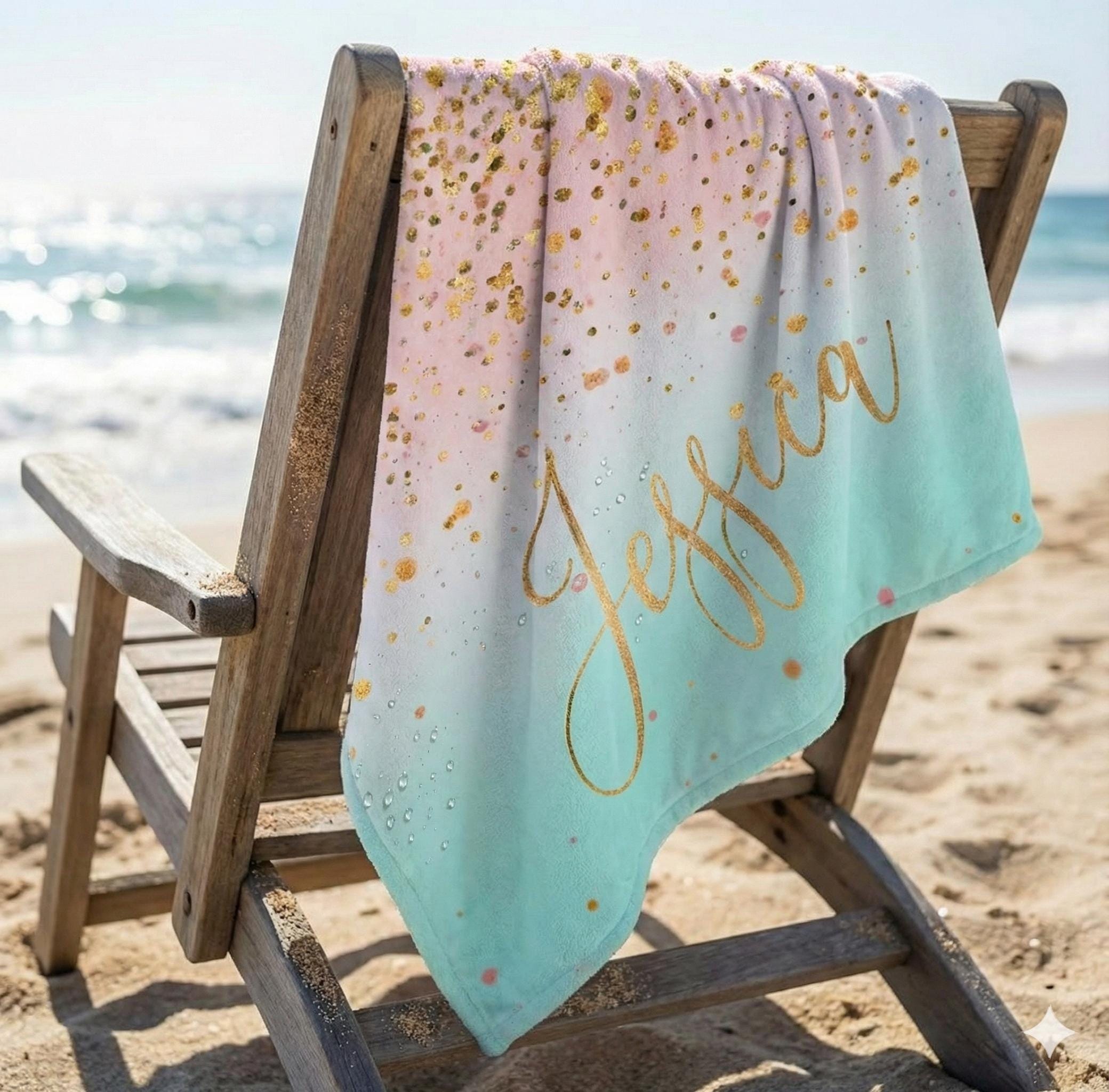 This Large Sparkling Gold Name Custom High-Quality Beach Towel measures 30 x 60 inches. It’s made with an absorbent, fast-drying soft 50% Cotton cloth that’s perfect for use at the beach, spa, and home. Personalized beach towel features super-soft 50% poly fleece front side with 50% cotton terry loop quality backing. Printed design is edge-to-edge on fleece face in vibrant full-color with our unique printing process that is durable and won't fade or bleed! Our premium custom beach towel measures approximately 30" x 60" and is printable on a single side only. Perfect for relaxation plus staying dry all day, in style. It features this Etsy listing design on the front printed in spectacular sharp detail, please check out our other Etsy listing for more design options. The back is a solid white soft and absorbent cotton that makes drying of swift and easy.